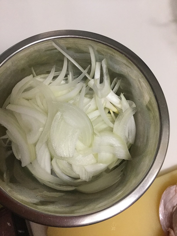 1. 鳥ももを2cm角切り、玉ねぎを千切り。