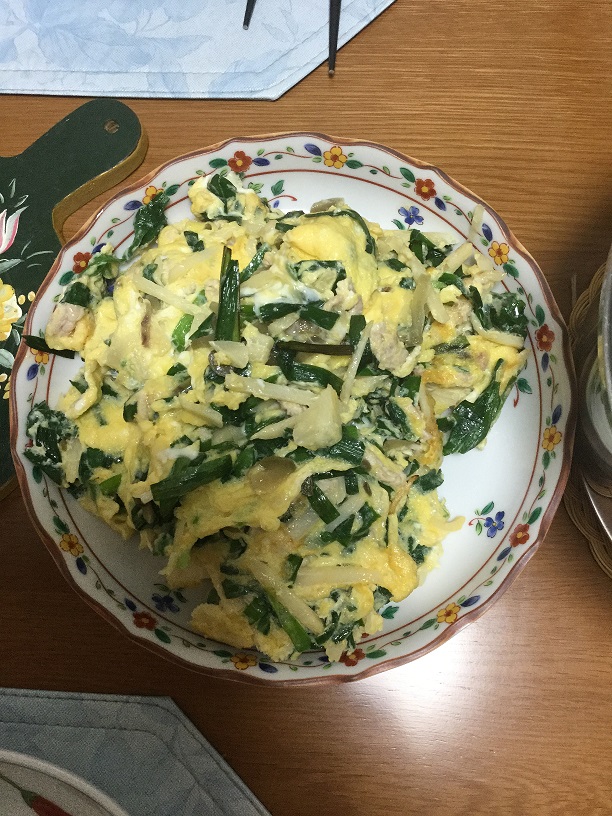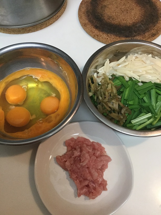材料:にら1束、たけのこ1/8、ザイサイ少々、豚肉1小塊、卵3個