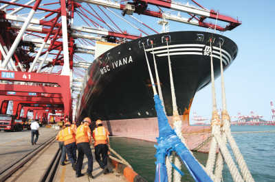 青島港碼頭。 本報(bào)記者 趙永琦攝 系纜工將“戴克”號(hào)最后幾根直徑10余厘米的粗纜,合力套在碼頭粗大的鐵樁上。 本報(bào)記者 趙永琦攝 9月2日下午,記者來(lái)到青島港前灣三期集裝箱碼頭。 15時(shí)55分,“地中海伊凡娜”安靜地停泊在青島港前灣三期集裝箱碼頭81號(hào)泊位,高大的橋吊正在裝卸貨物。 “它比航空母艦大多了。”碼頭操作一大隊(duì)大隊(duì)長(zhǎng)劉勇說(shuō)。 這條長(zhǎng)363.57米、高45米多的超級(jí)大貨輪,吃水15.6米,載重逾13萬(wàn)噸,可搭載11660個(gè)標(biāo)準(zhǔn)集裝箱,是目前世界重量級(jí)貨輪中的“第一梯隊(duì)”。劉勇說(shuō),“在咱這碼頭上,能停靠世界上最大的集裝箱貨輪。” 不遠(yuǎn)處的82號(hào)泊位上,304米長(zhǎng)的“戴克”號(hào)貨輪剛剛停穩(wěn),系纜工正在系纜,這同樣是一艘載重量極大的“巨無(wú)霸”。劉勇攤開(kāi)一張表單,告訴記者,它從伊朗來(lái),經(jīng)大連至青島,目的地是上海。 面孔黝黑的劉勇頗有幾分自豪地說(shuō),自己已在青島港工作了26年,每天都能見(jiàn)到大量的貨輪從歐洲、美國(guó)、西亞等國(guó)家和地區(qū)來(lái)到這里,又前往世界各地。 目前,青島港與世界上130多個(gè)國(guó)家和地區(qū)的450多個(gè)港口有貿(mào)易往來(lái)。 16時(shí)10分,系纜工將“戴克”號(hào)最后幾根直徑10余厘米的粗纜,合力套在碼頭粗大的鐵樁上,完成了固定輪船工作,等待卸貨。濕漉漉的纜繩浸透了世界各大洋的海水。 很快,沿著與碼頭平行的鐵軌,橋吊開(kāi)了過(guò)來(lái),停靠穩(wěn)當(dāng),開(kāi)始裝卸。一輛輛拖車(chē)陸續(xù)開(kāi)了過(guò)來(lái),各裝上一個(gè)集裝箱,有序離開(kāi)。港口有配套的物流設(shè)施,會(huì)將貨物短時(shí)內(nèi)分運(yùn)到全國(guó)各地。 “貨輪大都是各公司租賃的,時(shí)間就是金錢(qián),咱青島港集裝箱裝卸承諾‘10小時(shí)完船保班’。”碼頭上,一名工人告訴記者,從輪船靠岸到裝卸集裝箱后離港,青島港是世界上唯一一個(gè)承諾能在10小時(shí)內(nèi)完成的港口。 這個(gè)承諾的背后,是許振超等青島港工人“一鉤準(zhǔn)”、“一鉤凈”、“無(wú)聲響操作”等先進(jìn)橋吊技術(shù)的支撐,是“振超效率”的打底。青島港集裝箱裝卸效率、鐵礦石卸船效率世界第一。 許振超,這個(gè)初中畢業(yè)卻聞名世界各大港口的中國(guó)工人,除了自己鉆研技術(shù),還帶出了“王嘯飛燕”、“顯新穿針”、“劉洋神繩”等一大批具有社會(huì)影響的工作品牌。 “一代人要有一代人的作為,一代人要有一代人的貢獻(xiàn),一代人要有一代人的犧牲”。在青島港,這個(gè)標(biāo)語(yǔ)十分醒目。 劉澤森在青島港工作了10年,現(xiàn)任裝卸班班長(zhǎng)。他和工友每人有3樣“必備裝備”:一個(gè)開(kāi)水杯、一截鋼筋、一根安全帶,它們一溜擺開(kāi)放在岸邊。天熱,裝卸工出力出汗多,有時(shí)要用鋼筋撬重物,工作環(huán)境就是水泥、鋼筋、輪船和海水。每天的工作都是如此。 效率、品牌、兌現(xiàn)承諾、貢獻(xiàn),青島港人用汗水和犧牲換來(lái)自豪。改革開(kāi)放以來(lái),青島港吞吐量迅速增加,作為中國(guó)面向世界的窗口,它已成為太平洋西海岸重要的國(guó)際貿(mào)易口岸和海上運(yùn)輸樞紐,世界第七大港,集裝箱世界第八大港。2010年,青島港吞吐量超過(guò)3.5億噸。 從高逾50米的橋吊俯視港區(qū),碼放整齊的各色集裝箱一眼望不到頭。 不遠(yuǎn)處的另一泊位上,一艘寫(xiě)著“COSCO”(中遠(yuǎn)集團(tuán))的貨輪正在靠岸,尋找合適的停泊位置,然后馳向世界。 青島港“孫波效率”第13次刷新世界紀(jì)錄 本報(bào)青島10月7日電(記者王建高 通訊員焦蘭坤)今天下午,在滿(mǎn)載17.1萬(wàn)噸外貿(mào)礦的“中華和平”輪卸船作業(yè)中,青島港“孫波效率”以單船卸率6769噸∕小時(shí)的速度,第13次刷新世界鐵礦石接卸紀(jì)錄。 作為創(chuàng)造世界紀(jì)錄“專(zhuān)業(yè)戶(hù)”,青島港前港公司從未停止前進(jìn)的腳步。從2003年第一次刷新礦石接卸世界紀(jì)錄至今,前港公司已先后13次刷新世界紀(jì)錄,僅今年就累計(jì)3次勇破世界鐵礦石接卸紀(jì)錄。前港公司經(jīng)理張?jiān)俅赫f(shuō):“‘孫波效率’是我們的服務(wù)品牌。我們就是要用世界級(jí)品牌,贏得世界的青睞,把礦石船都引到青島港。” 國(guó)慶節(jié)期間,青島港前港公司在組織裝卸生產(chǎn)大會(huì)戰(zhàn)的同時(shí),還開(kāi)展了火車(chē)疏運(yùn)大會(huì)戰(zhàn),全力支持裝卸一線快卸、快疏、快運(yùn)。在“中華和平”輪靠泊之前,前港公司就提前根據(jù)船型、貨種等信息,研究、制定了周密的分艙卸船方案,并細(xì)化過(guò)程控制,按小時(shí)抓計(jì)劃兌現(xiàn)率,同時(shí)還積極爭(zhēng)取鐵路方面支持,多爭(zhēng)取車(chē)皮,多挖掘堆場(chǎng)空間,確保礦石卸得下、運(yùn)得出,進(jìn)而構(gòu)架了前方兩條皮帶流程雙線卸船作業(yè),后方兩臺(tái)裝車(chē)樓雙車(chē)驅(qū)動(dòng)作業(yè)的機(jī)械化、現(xiàn)代化、流程化的生產(chǎn)格局。 最終,孫波團(tuán)隊(duì)用25小時(shí)15分鐘,完成“中華和平”輪的作業(yè)計(jì)劃,以6769噸/小時(shí)的卸率再破“孫波效率”。 “決不讓一個(gè)員工