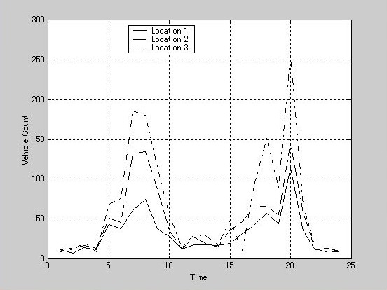 》 plot(t,count), legend('Location 1','Location 2','Location 3',0) xlable('Time'),ylabel('Vehicle Count'), grid on