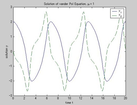 》 title('Solution of vander Pol Equation, \mu = 1');