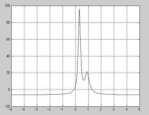 y = 1./((x-0.3).^2 + 0.01) + 1./((x-0.9).^2 + 0.04) - 6;