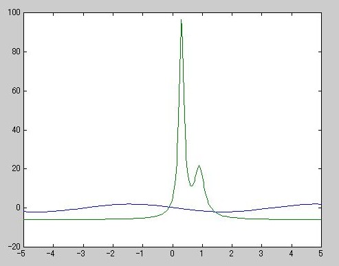 》 fplot(inline('[2*sin(x+3), humps(x)]'),[-5 5])