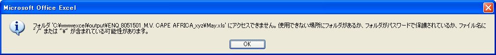 OLE exception from "Microsoft Office Excel": ファイル 'C:\wwwexcel\output\ENQ_8051501_M.V. CAPE AFRICA_xyz\May May' にアクセスできません。次のいずれかの理由が考えられます。 ? ファイル名またはパスが存在しません。 ? ファイルが他のプログラムによって使用されています。 ? 保存しようとしているブックと同じ名前のブックが現(xiàn)在開かれています。 Win32::OLE(0.1701) error 0x800a03ec in METHOD/PROPERTYGET "SaveAs" at ./pro/mscenq2.pl line 679